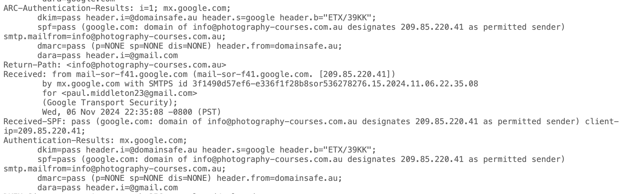 When I send an email from paul@domainsafe.au (a secondary domain in my Workspace account) the header includes the smtp.mailfrom value info@photography-courses.com.au.